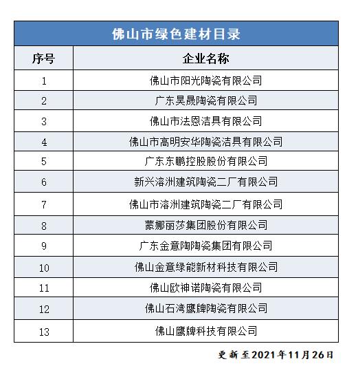 为加快推进绿色建材产品应用,促进绿色建材产品认证实施。 近日,佛山市住房和城乡建设局、工业 和 信息化 部发布了《2021年度绿色产品设计名单》、《佛山市第十二批绿色建材目录》,共有22家陶瓷企业的350款陶瓷产品获绿色认定。 9家陶企、24款陶瓷产品入选绿色设计名单12月10日,工业 和 信息化 部官网公示拟入选的《2021年度绿色制造名单》,共有637个企业工厂入选《2021年度绿色工厂名单》,包括北京科勒有限公司、内蒙古建能兴辉陶瓷有限公司、广西欧神诺陶瓷有限公司、重庆唯美陶瓷有限公司、帝欧家居股份有限公司等5家陶瓷卫浴企业。 ![]() 此外,125个品类的相关项目入选《2021年度绿色产品设计名单》。 在陶瓷砖方面,河南省嘉北科技有限公司、河南中祺陶瓷有限公司、湖南天欣科技有限公司、佛山市高明区新粤丰建材有限公司、佛山市新联发陶瓷有限公司、广东金意陶陶瓷集团有限公司、广西欧神诺陶瓷有限公司等7家陶瓷企业的19款陶瓷砖产品入选;产品绿色设计亮点为:产品反射性符合国家标准、产品耐污染、抗化学腐蚀、单位产品综合能耗达到国家标准限定值、产品全生命周期内对人体健康损害及不可再生资源消耗影响较小。 ![]() 13家陶企、326款陶瓷产品获绿色认定11月26日,佛山市住房和城乡建设局公示《佛山市第十二批绿色建材目录》,共有8家企业的产品获绿色建材认定。 截至当日,在陶瓷产品方面,佛山市共有佛山市阳光陶瓷有限公司、广东昊晟陶瓷有限公司、佛山市法恩洁具有限公司、佛山市高明安华陶瓷洁具有限公司、广东东鹏控股股份有限公司、新兴溶洲建筑陶瓷二厂有限公司、佛山市溶洲建筑陶瓷二厂有限公司、蒙娜丽莎集团股份有限公司、广东金意陶陶瓷集团有限公司、佛山金意绿能新材科技有限公司、佛山欧神诺陶瓷有限公司、佛山石湾鹰牌陶瓷有限公司、佛山鹰牌科技有限公司等13家陶瓷卫浴企业的326款产品获绿色认定。 ![]() 此外,佛山市住房城乡建设局在国有资金参与投资建设的医院、学校等八大类新建工程项目中确定了70个绿色建材试点项目,试点项目建筑面积共约259万平方米,总投资额约166.7亿元。 同时,住房城乡建设局根据工程实践与建材特性,结合佛山当地的建材产业现状,从多维度出发,将绿色建材分为“必选绿色建材”与“可选绿色建材”。 资料图 图文无关其中,陶瓷砖、卫生洁具等13类材料被列为“必选绿色建材”,试点项目如有应用相关类别建材则必须使用绿色建材(应用比例原则上为100%),必须使用目录内产品。